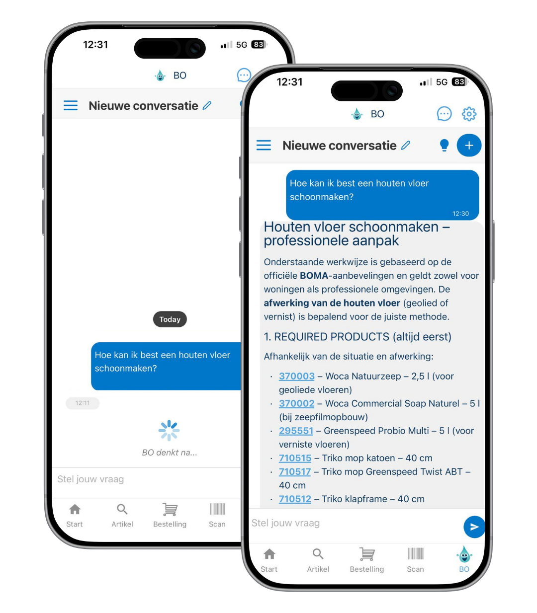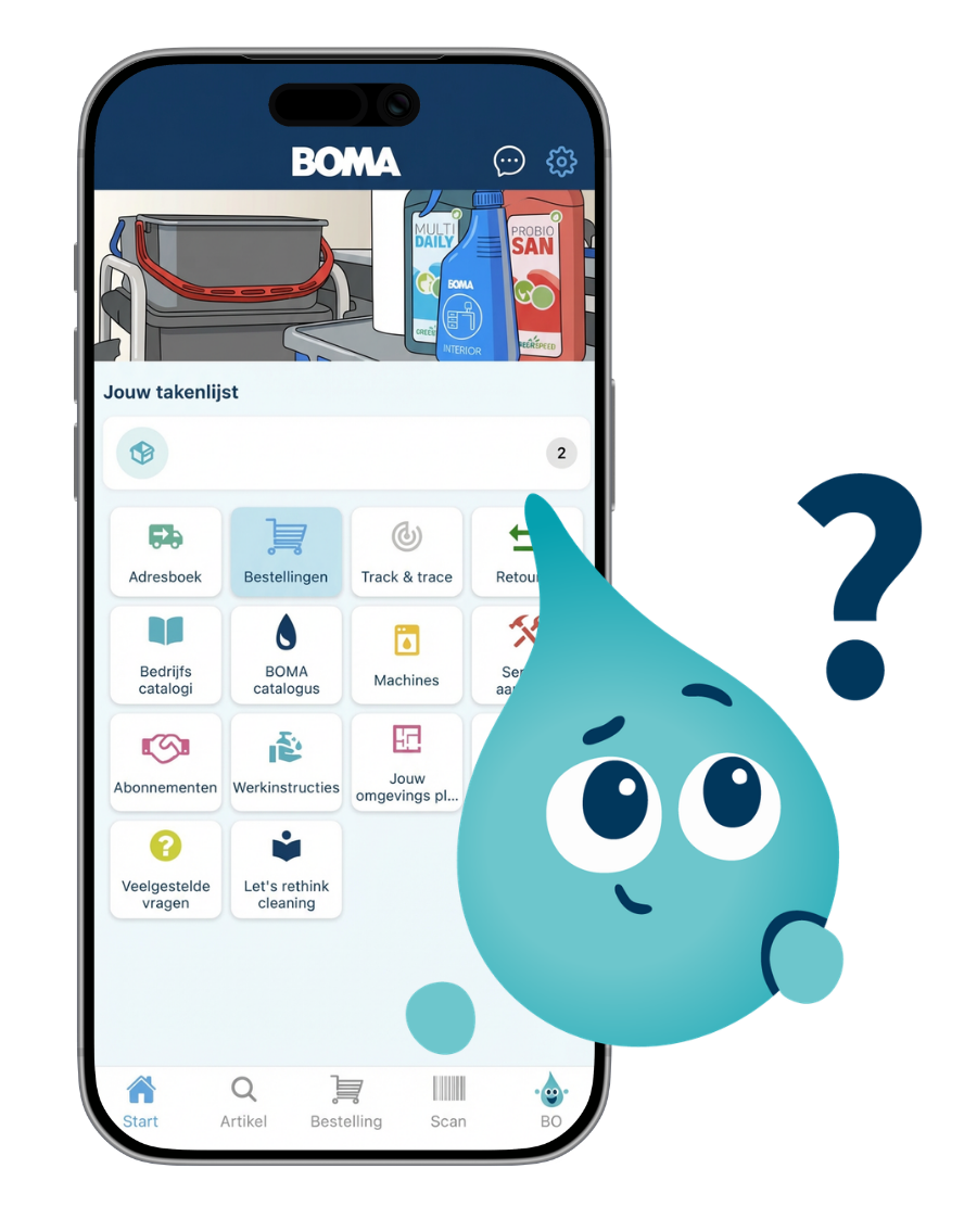 Een vraag over schoonmaakproducten, -procedures of duurzame keuzes? BO staat 24/7 voor je klaar in onze app BOMA in the Pocket (BiP) en de klantomgeving op onze website. Zo krijg jij snel en efficiënt antwoord, waar je ook bent.